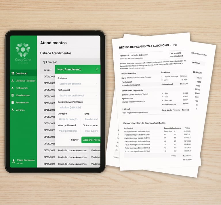 O Coopcare Manager é um sistema web voltado para a equipe administrativa da Coopcare, uma cooperativa de profissionais de saúde. Seu objetivo é organizar e automatizar a gestão de cadastros de clientes, pacientes e profissionais, além de controlar a execução de plantões e atendimentos avulsos realizados. A ferramenta também gerará relatórios mensais para cobrança dos serviços prestados e para pagamento de profissionais via RPA (Recibo de Pagamento Autônomo).
